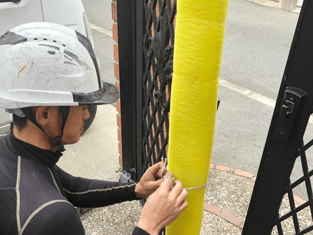 植木・手摺・門扉など傷つきやすい物、大切にされている物の移動を行います又、プラベニア・スポンジなどで養生をします。※足場組立完了後は報告連絡を行います。