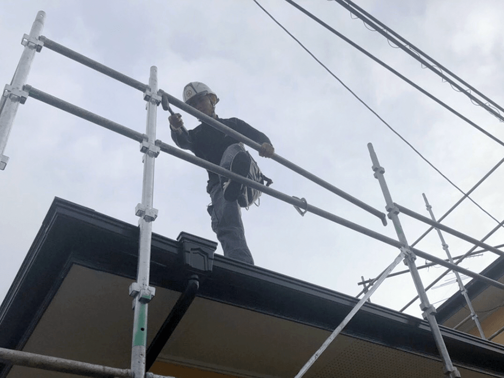足場解体完了後建物などに傷がついていないか、道具や資材が落ちていないかなどを確認し、清掃を行い施主様と近隣の方にご挨拶をして工事完了となります。※足場解体完了後は報告連絡を行います。